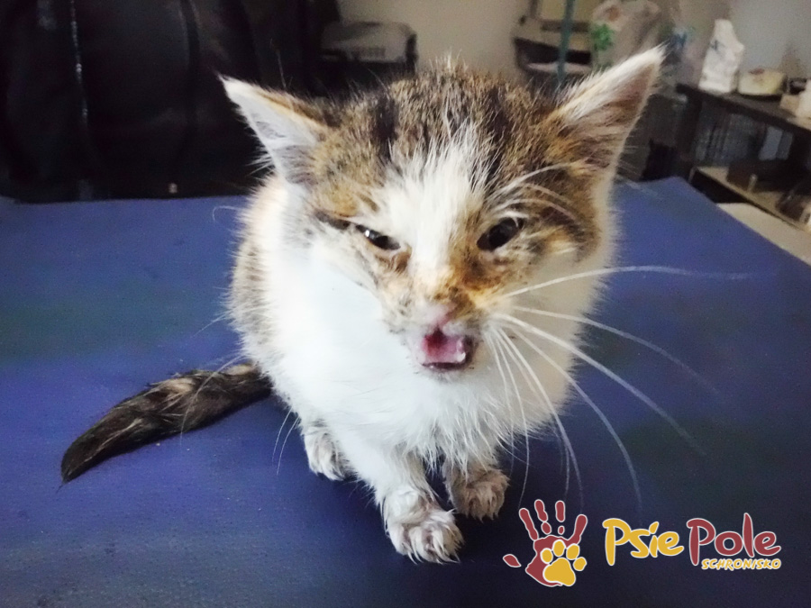 Starsza kotka – Kana – ma około 5-7 miesięcy, ma katar, ale jej temperatura ciała jest właściwa. Kicia waży 2,7 kg.
